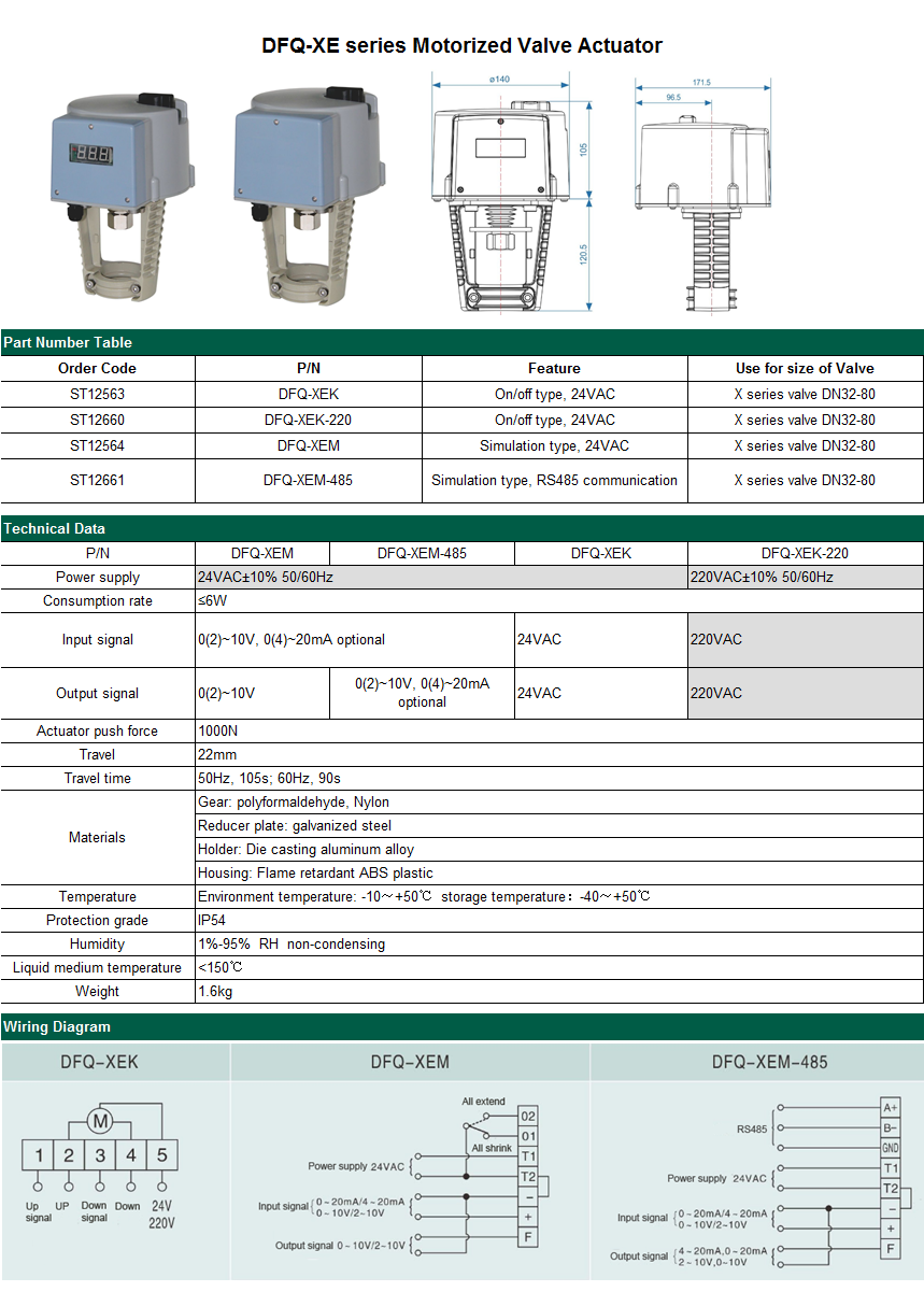 DFQ-XE series motorized valve actuator can match with 2 or 3 way motorized valve to adjust the medium flow. It is widely used in central air conditioning system, heating or others. It can control single-room temperature or complex building. It can make energy efficiently and obtain a comfortable environment and save energy by control the flow.