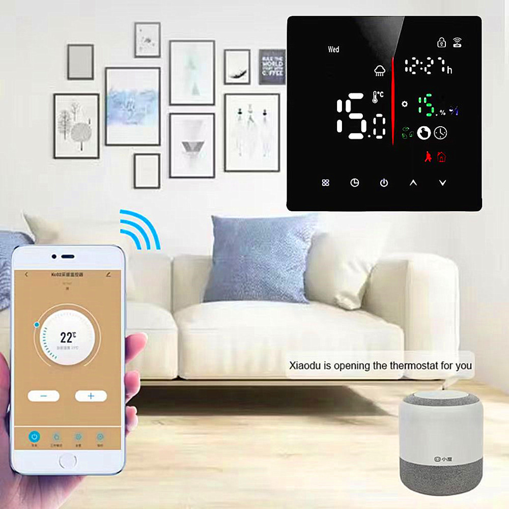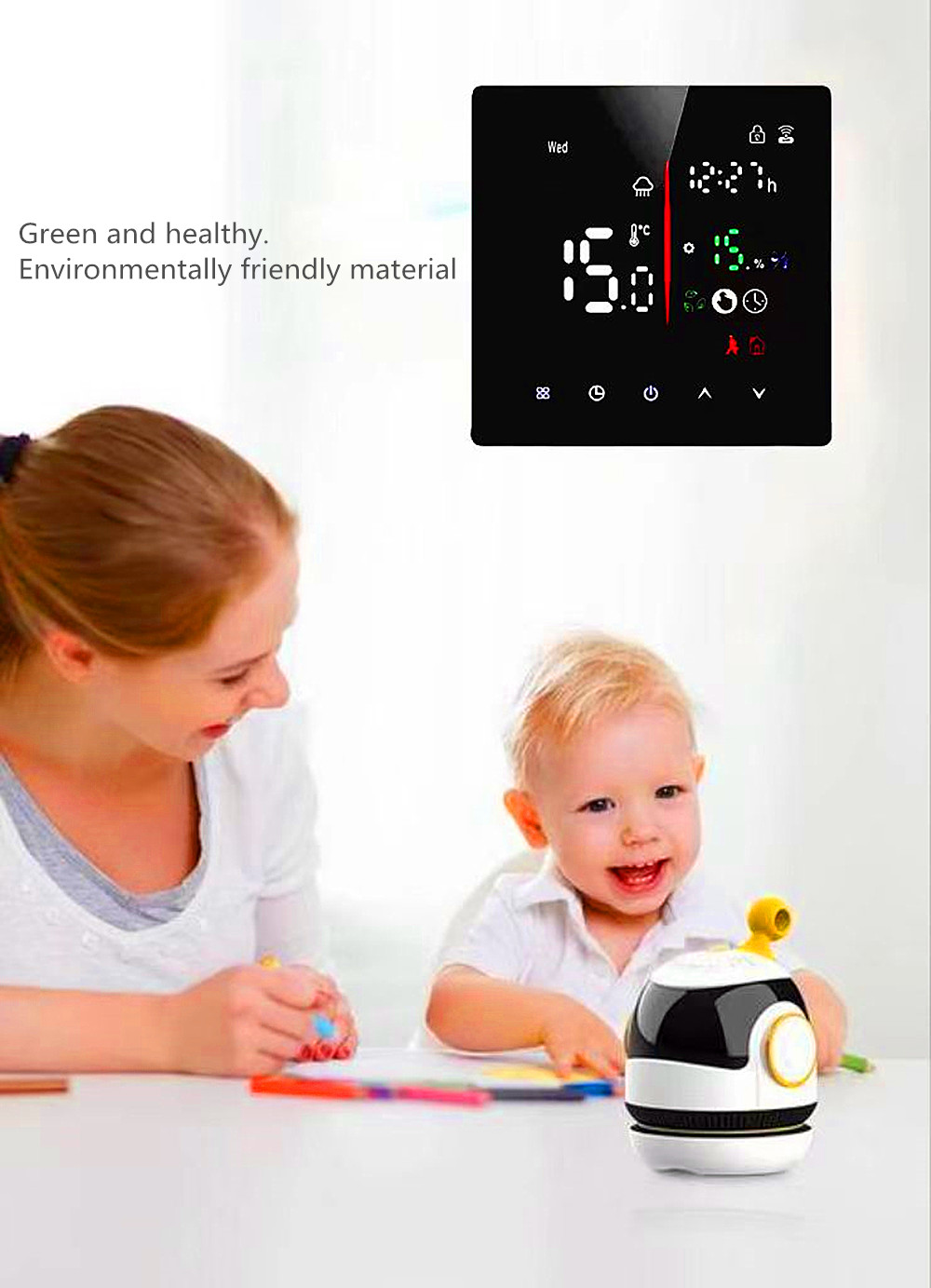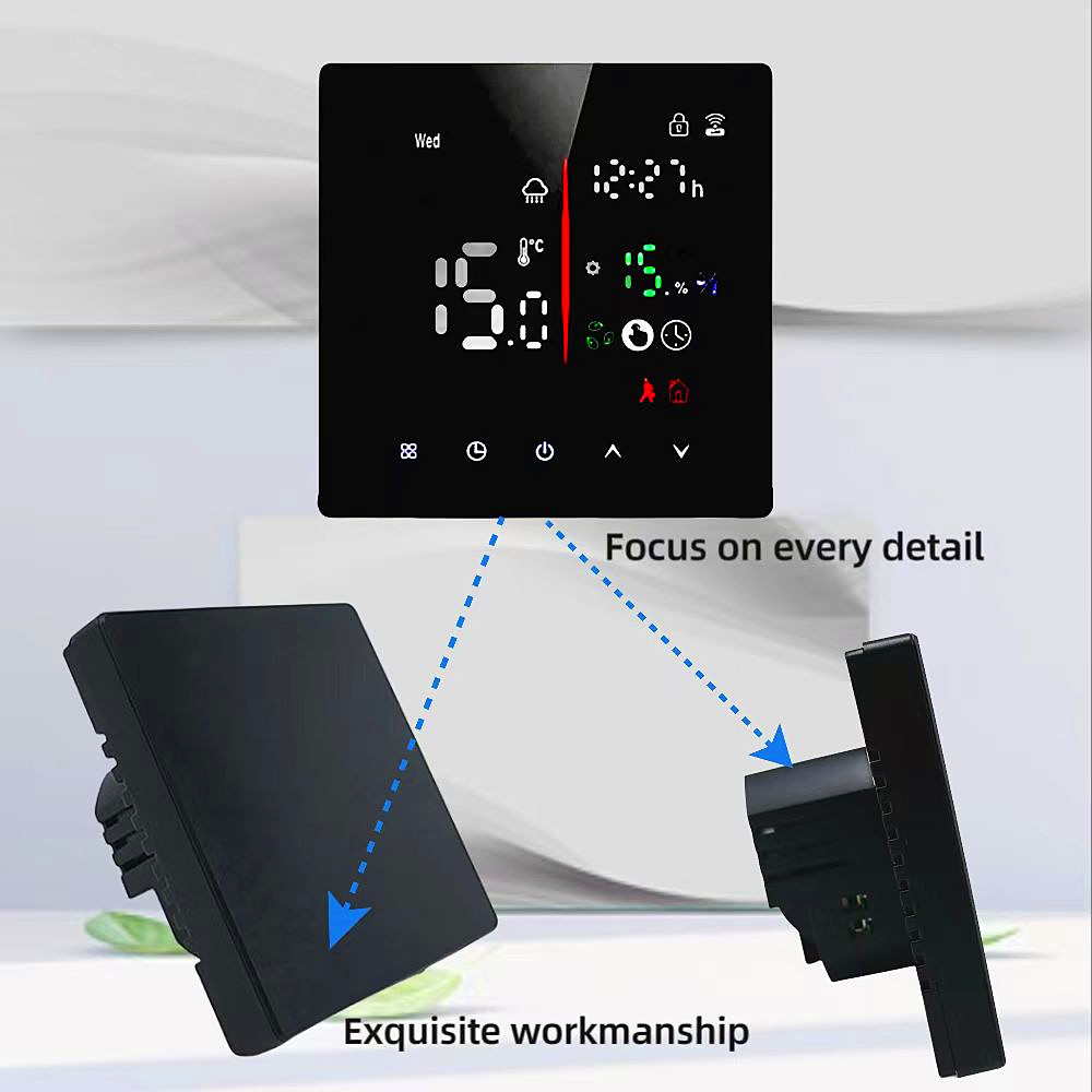 This touch screen thermostat adopts microcomputer control technology, full-screen display touch screen, elegant design, easy to use, with manual, automatic and ECO modes.