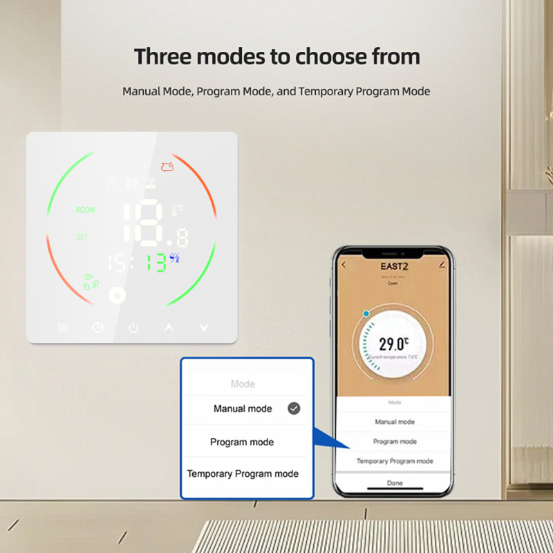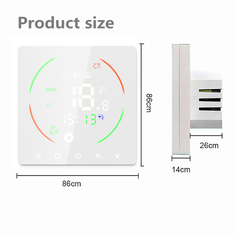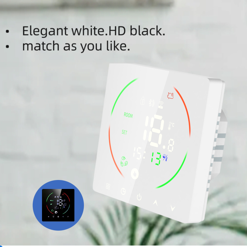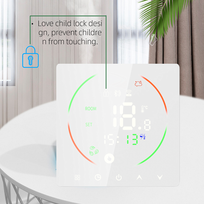 This digital thermostat adopts microcomputer control technology, full-screen display touch buttons, elegant design, easy to use, with manual, automatic, programmable, and state memory functions.